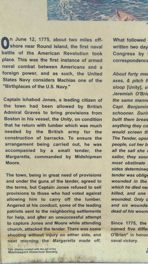 We drove around some of the surrounding area before crossing back into the United States. We had decided to drive a different route back taking us on a southwestern swing to visit Machiasport, Maine. I learned this is considered the birthplace of the American Navy. On June 12, 1775 a group of American Patriots boarded and took over a British ship heading down to Boston and captured the ship and the crew. This marked the first time Americans fought a battle against a foreign country at sea.