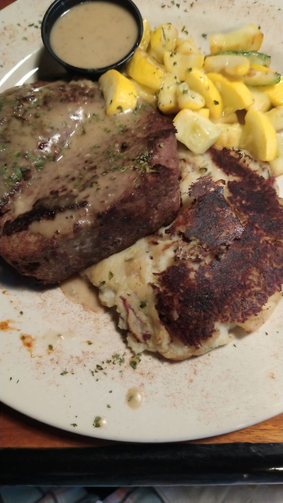 We ate at a place called Gritty McDuff’s. We were both pleasantly surprised. The food was good and the service was outstanding. We shared an order of fried mushrooms, Darlene had French Onion Soup and I had a meatloaf dinner. The meatloaf was made of ground beef, ground pork, and ground andouille sausage served with a potato pancake and squash. I would recommend it to anyone eating there.
