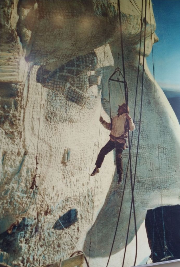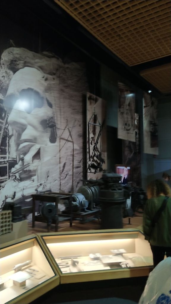 The fog was beginning to lift, but only a little. We decided to go down to The Borglum Museum. I found this fascinating. Gutzon Borglum was the artist, the sculptor, and engineer on the massive undertaking. We found it incredible that most of the mountain was done by blasting with dynamite. Borglum figured out how much of a charge of dynamite was needed to remove a certain amount a rock at a time. Then drills and finishing tools were used to form the presidents faces by Borglum and his men hanging from ropes, pulleys, and wooden chairs. I think I would have had to pass.