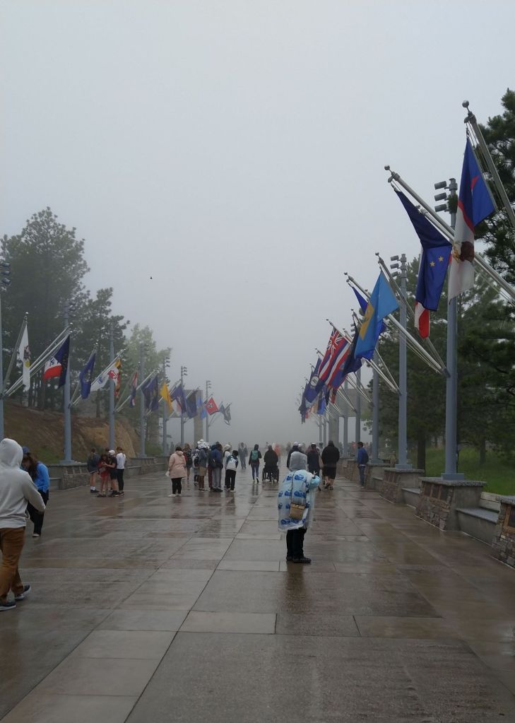 We left the gift shop and looked directly at The Avenue of Flags. That is a walkway leading to Mount Rushmore. The fog had not yet lifted, so we could not see the top of the mountain with the faces.
