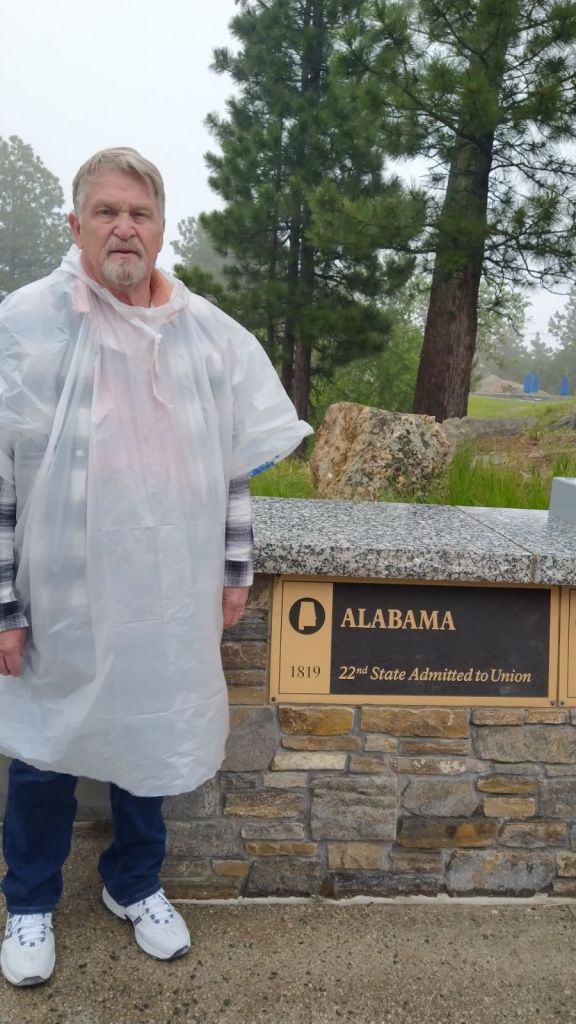 Darlene and I woke up to a misty rain and chilly temps at our cabin. We don’t and can’t control the weather, so it is off to Mount Rushmore. We got there and a dense fog had set in the upper elevation of Keystone which includes Mount Rushmore. We had this trip planned for almost 5 months, so make the best of it. We got in The National Park and headed for the gift store to buy a couple of ponchos. We asked the lady by the door and she directed us toward that area. She told my wife, ” see the real friendly southern to lady for help. She is about your height.” That is just a polite way if saying short. Darlene and she started talking and learned we were from the south as was she. The woman said ” War Eagle?” My wife is an Auburn fan and I pull for Alabama. We often hear a “roll tide” since I wear a Bama shirt a good bit, but we don’t hear many Auburn battle cries. The lady helps us with the ponchos and tells Darlene, ” be sure and see the woman by the front door that is painting. Tell her “War Eagle.” We stopped by her easel where she was painting. The woman was thrilled to talk with some folks from the south and especially my wife being the Auburn fan. Turns out both her and her husband were retired professors from Auburn. Same thing we found from our Maine trip, it really is a small world