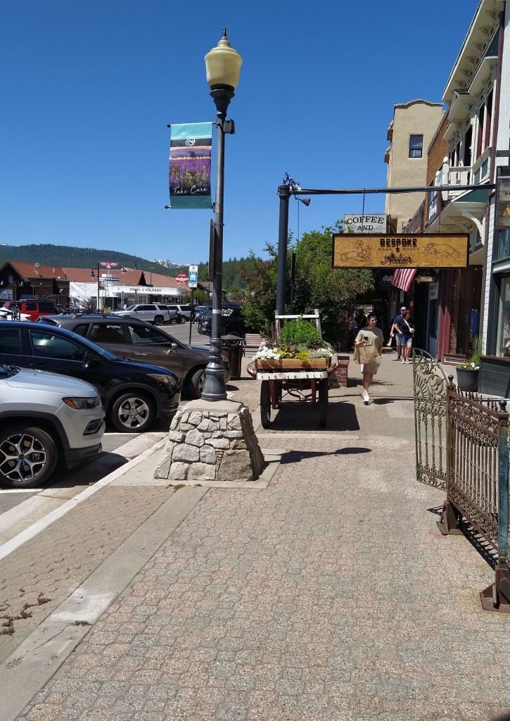 The drive higher into the Sierra Nevada Mountains was very scenic following the Truckee River and snow capped peaks. We both noticed this west side of Reno was much different and prettier than the east side. We got into the town of Truckee and similar to Virginia City to the east, it is mostly a main street town. Most of the shops and restaurants are lined on that main street. We visited a couple of the local shops and talked about how nice the people were and how they were proud of their town. They have planters and flower carts lining both sides of the street giving it a very clean, fresh, and colorful appearance. The brick sidewalks were level and easy to walk on.